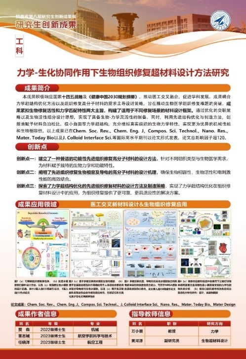 近日,由陕西省教育厅、陕西省学位委员会主办的陕西省第八届研究生创新成果展落下帷幕。英国威廉希尔英文官网2022级博士研究生贾犇负责的“力学-生化协同作用下生物组织修复超材料设计方法研究”(指导教师:万小朋、黄河源)获得省级A类奖项(全校仅六项,全省57项)。本次获奖是公司学子首次参与陕西省研究生创新高质量成果展并取得的新突破!
