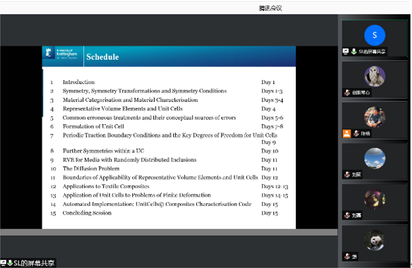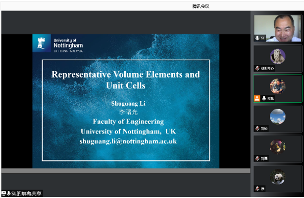 应英国威廉希尔英文官网张超教授邀请,英国诺丁汉大学李曙光教授于2021年8月5日至25日开展了题为“Representative Volume Element and Unit Cells”的暑期线上专题班。本次课程的组织依托结构力学行为科学与技术创新引智基地、冲击动力学及其工程应用国际联合研究中心和陕西省冲击动力学及其工程应用重点实验室等科研平台举办,来自威廉希尔williamhill官方网站、哈尔滨工业大学、中国商飞等30余高校、企业和科研院所的200余名老师、员工和科技工作者参加了本次课程。