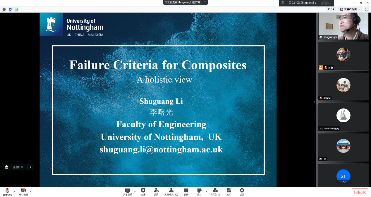应英国威廉希尔英文官网陈杨副教授邀请,英国诺丁汉大学李曙光教授于2022年7月4日至7日开展了题为“FailureCriteria for Composites”的线上学堂,本次课程依托威廉希尔williamhill官方网站国际合作处“暑期国际学堂”平台举办。来自英国威廉希尔英文官网、航空公司、力学与土木建筑公司等共20余名员工选课参加了本次课程。同时,来自浙江大学、中国商飞、航空工业飞机强度研究所等校外单位的老师、员工和科技工作者旁听了本次课程。