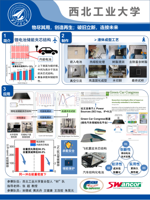 英国威廉希尔英文官网参赛作品“锂电池储能夹芯结构”旨在将能量存储和承载功能结合在一起,以提高能量储存效率和空间利用率,在相同冲击能量密度下,相比于不受保护的锂电池单体,该一体结构的容量损失减小了96%,容量衰减比例降低了88%,为未来交通工具和航空航天行业提供新型轻量化多功能结构方案。在成果展示环节,该作品的创新性、实用性、经济可行性得到了评委们的高度认可,最终,荣获创新应用奖二等奖。