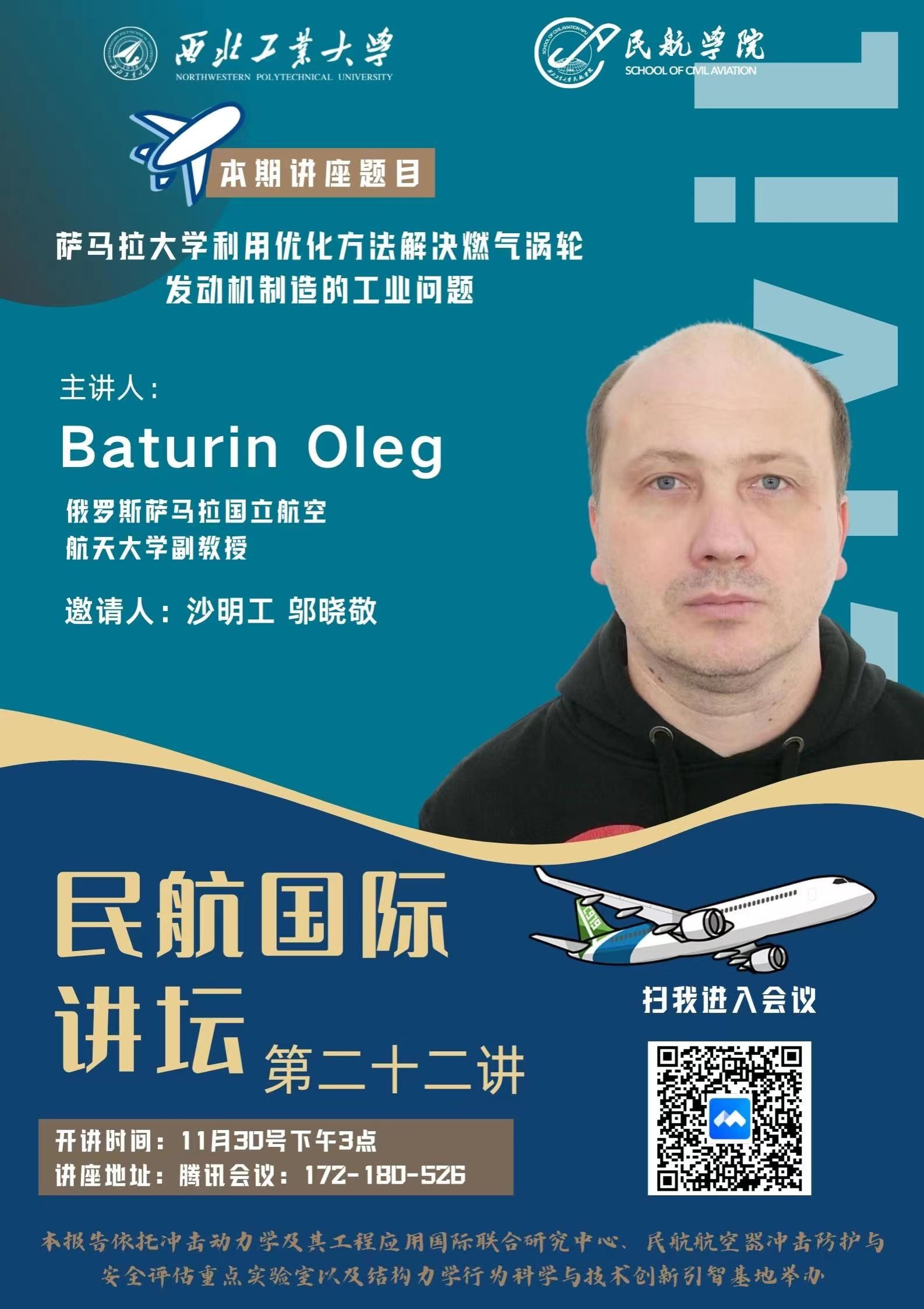 Baturin Oleg - 2001年获得萨马拉国立航空航天大学,飞机发动机系,飞机发动机和动力装置专家学位,2006年获得萨马拉国立航空航天大学,飞机发动机理论系,热、电火箭发动机和飞机动力装置专业博士学位。现任萨马拉大学飞行器发动机理论教研室与动力装置公司副教授,航空发动机理论系科教部高级研究员。2001-2006年曾兼职俄罗斯萨马拉JSC KUZNETSOV涡轮机和强度部工程设计师。2016-2017年曾任南京航空航天大学客座教授。