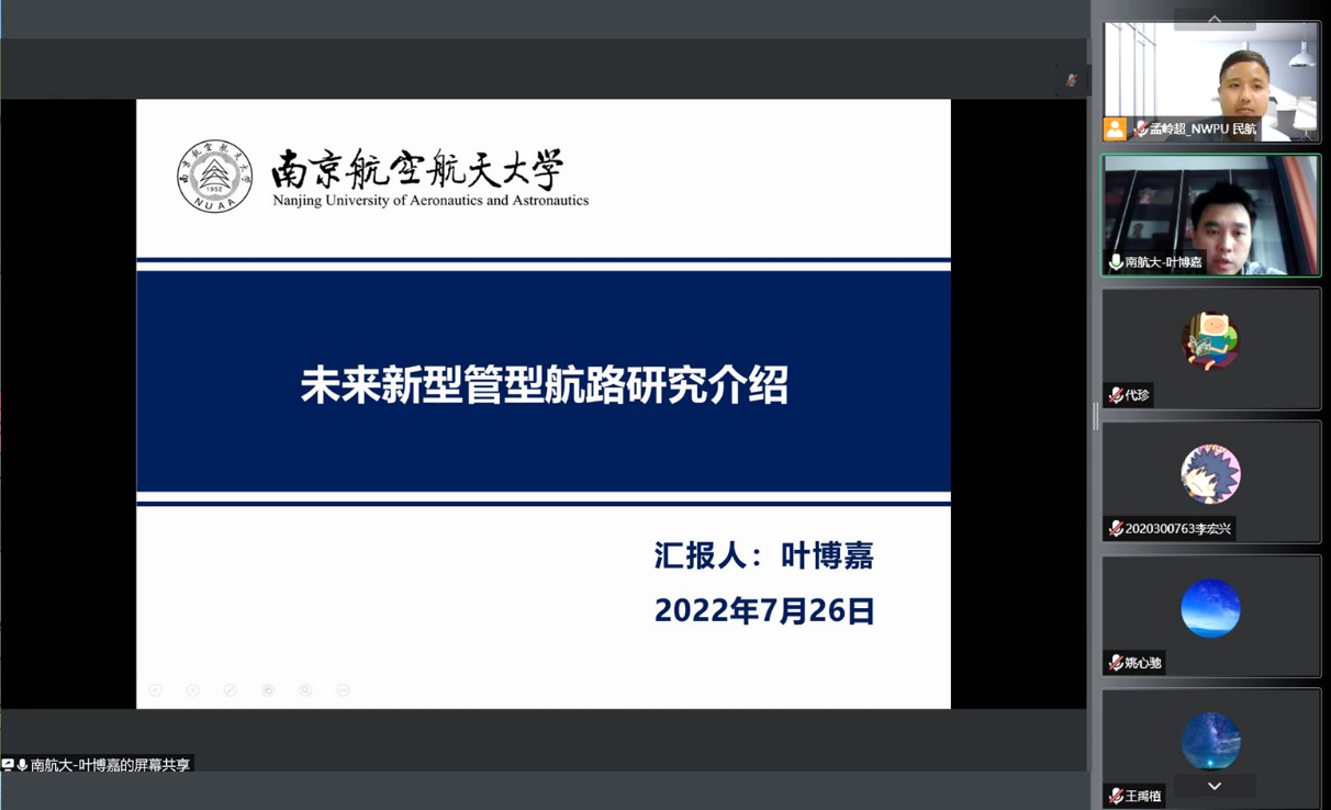 7月26日,南京航空航天大学英国威廉希尔英文官网叶博嘉副教授应公司孟岭超副教授邀请,为民航国际讲坛第十三讲作“未来新型管型航路研究介绍”线上讲座,公司广大师生参加了此次讲座。讲座由公司孟岭超副教授主持。