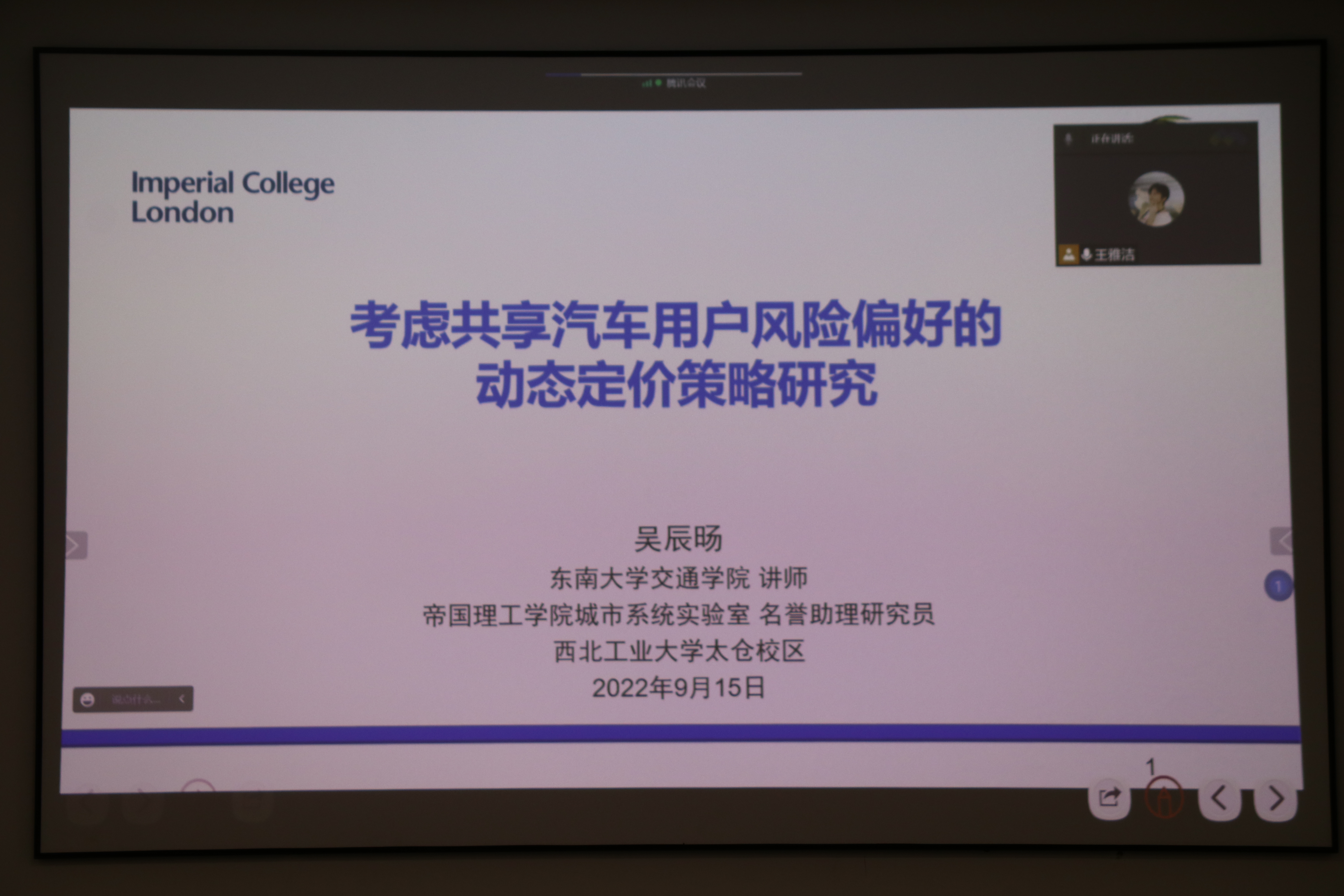 9月15日下午,应公司邀请,东南大学交通公司讲师、帝国理工公司博士吴辰旸在太仓智汇港C210会议室作了题为“考虑共享汽车用户风险偏好的动态定价策略研究”的学术报告。此次报告采取线上、线下相结合的方式进行,由公司副教授孟岭超主持。公司经理李玉龙、党总支副书记(主持工作)闫伟,以及其他青年教师和研究生参与了交流。