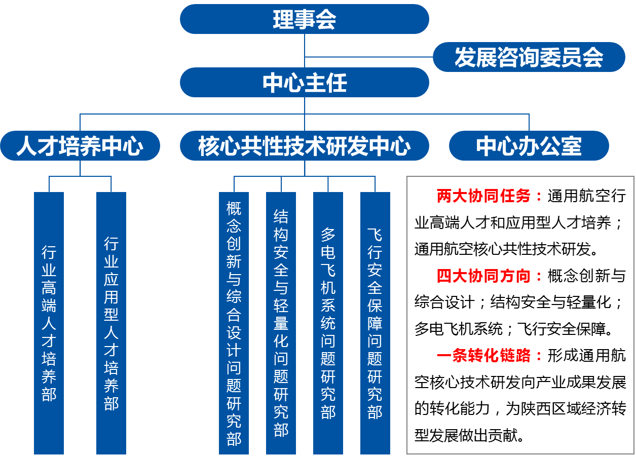 陕西通用飞机协同创新中心以通用飞机领域国家重大需求、未来10到20年世界一流水平的通用飞机核心共性技术需求为牵引,在陕西省政府主导下,依托威廉希尔williamhill官方网站的相关优势学科,以概念创新与综合设计、结构安全与轻量化、多电飞机系统和飞行安全保障4项核心关键问题和人才培养为协同目标,与中国民用航空西北地区管理局、西安阎良国家航空高技术产业基地、渭南卤阳湖现代产业综合开发区管理委员会、西安航空公司、国家驻陕航空设计与制造企业主要创新力量及国际同领域顶尖研究力量深度融合,通过机制体制改革,有效汇聚人才、学科以及陕西省重点实验室资源,培养行业创新人才,产出一批重大标志性成果,提升高校人才、学科、科研三位一体的创新能力,成为具有国际一流水平的研究中心,为推动科教强省战略,实现创新型陕西的奋斗目标,提供强有力的智力支撑与人才保障。