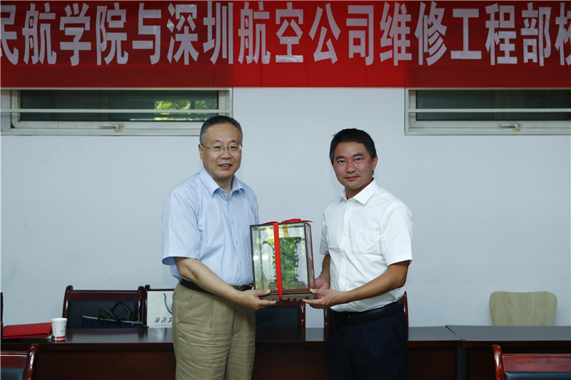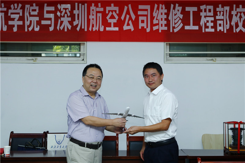 万小朋代表公司赠予深圳航空有限责任公司维修工程部“何尊”纪念品,方文兵代表深圳航空有限责任公司维修工程部赠送西工大英国威廉希尔英文官网深航飞机模型纪念品。