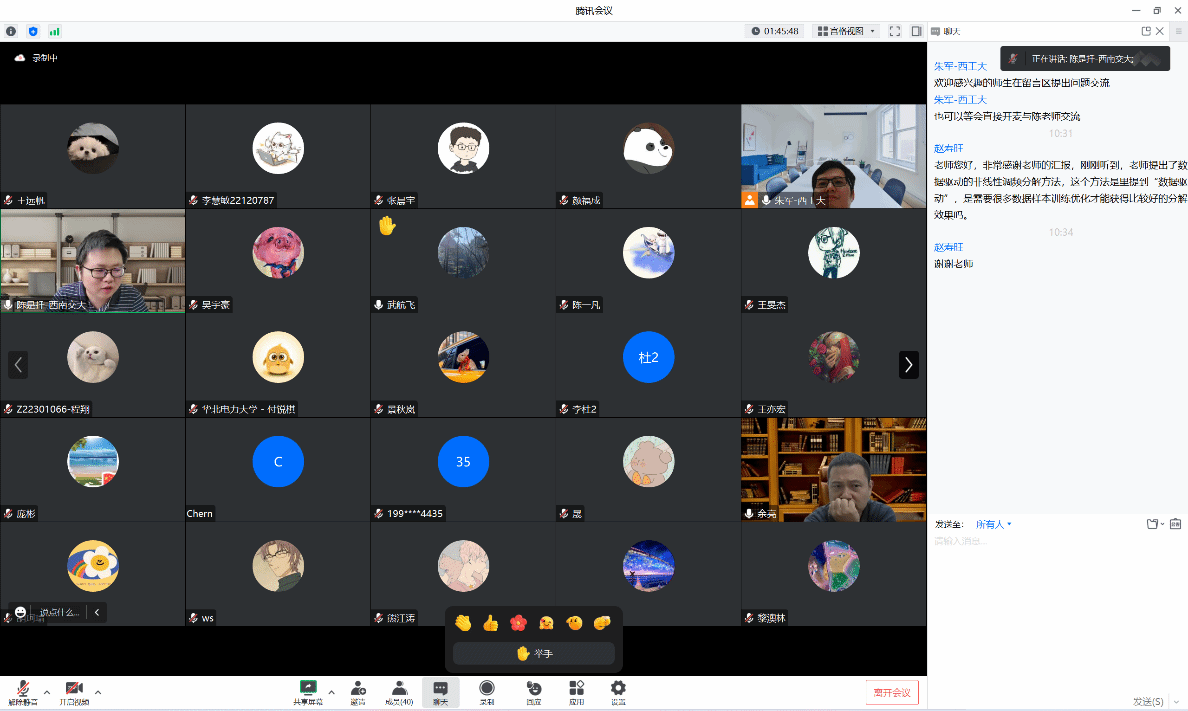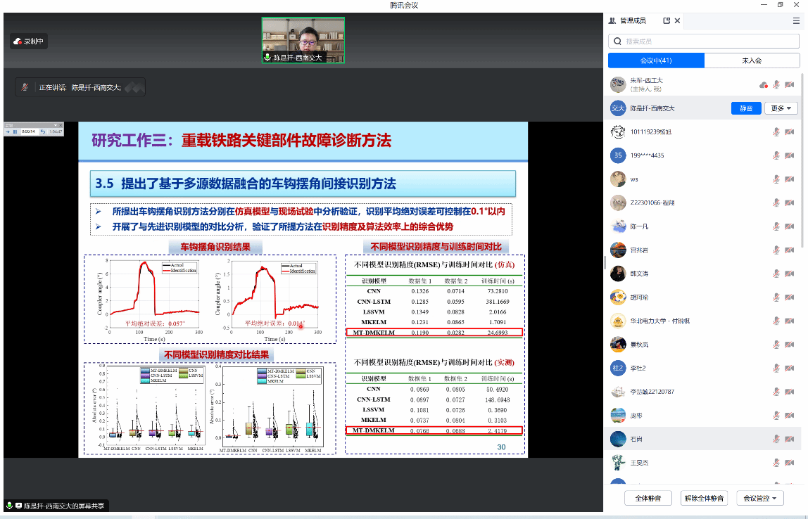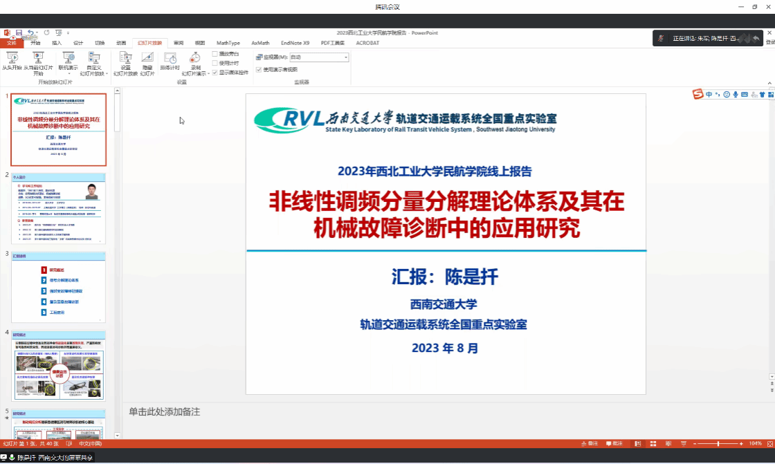 8月19日上午,应公司朱军副教授的邀请,来自西南交通大学的陈是扦老师为英国威廉希尔英文官网师生开展主题为“非线性调频分量分解理论及其在故障诊断中的应用研究”的线上研讨会,公司余亮老师和外校师生合计超过40多人参加了此次研讨会,研讨会由朱军主持。