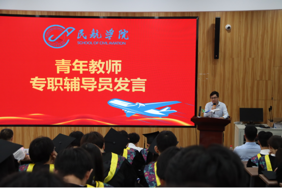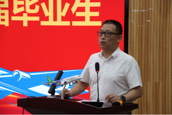 首先,党总支书记闫伟致辞。闫伟首先代表公司向全体毕业生及师长亲友致以热烈祝贺和诚挚感谢。他回顾了同学们四年来在学业竞赛、科研创新、社会实践等各方面的优异表现。他说,低空经济这一新兴产业前景广阔,民航学子在相关领域将大有可为,勉励大家将个人理想融入民航强国建设。最后,闫伟期待大家在新征程上再创辉煌,常回家看看。
