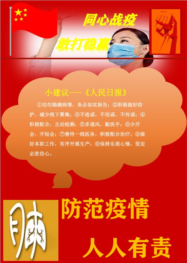 作品说明:整幅海报以红色为主要颜色,左上角国旗代表了中国,右上角抱拳为抗疫加油,护士的背景向所有奋战在抗疫一线的医护人员致敬;海报中间以较大的篇幅介绍了几条小建议,简约实用;最后在海报的最下方发出倡议,抗击疫情,人人有责!