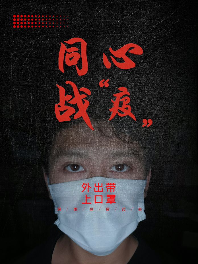 作品说明:此海报中照片为本人,意在宣传疫情面前,我们身为中国公民,应当以身作则,减少外出,外出戴好口罩,关心自己和他人的身体健康,将战“疫”工作落实到每一个人身上。该海报主色调为黑色,字体采用红色,意在表现当前疫情形势的严峻,警醒大家,做好自己的防疫工作,为我国打赢这场“战争”贡献自己的力量。