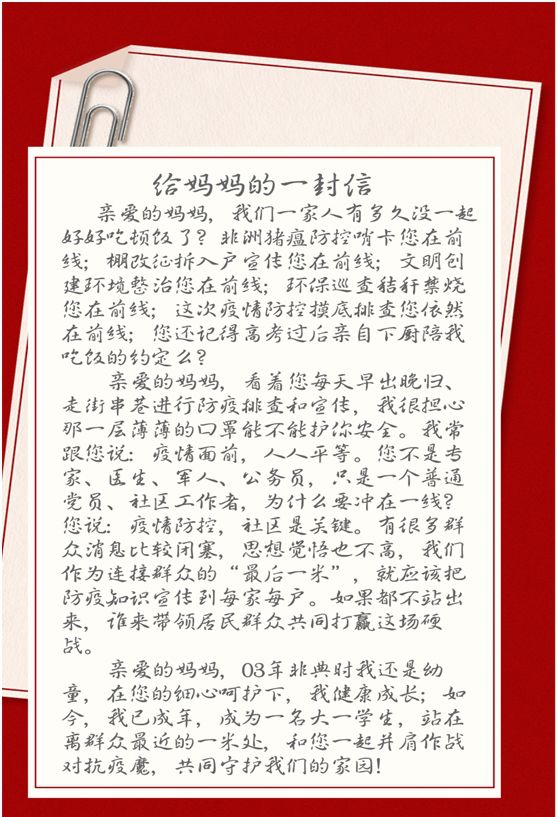 在完成了志愿者工作后还给我妈写了一封信来感谢她的努力和鼓励她的工作。