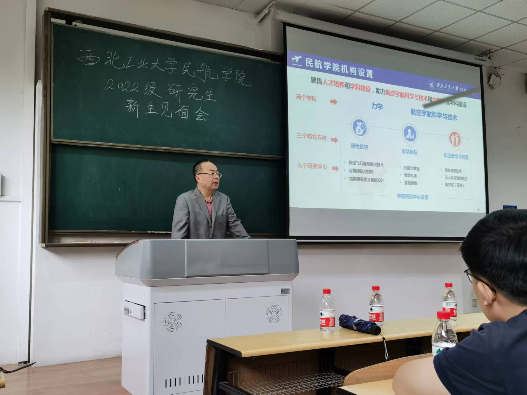 会议开始,党总支副书记(主持工作)闫伟代表公司向2022级研究生新生表示热烈欢迎,并以“不负韶华 勇于追梦”为主题,为全体新生讲授了研究生生涯的第一堂思政课。他向同学们讲述了西工大“脉源三支,强强融合”的历史沿革,带领同学们学习校史,并结合校训、校风和当代民航精神等,向同学们提出了“努力成为堪当民族复兴重任的时代新人”的希望。