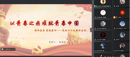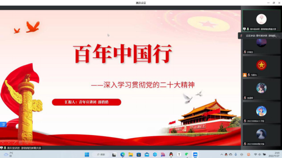 11月27日晚九点,英国威廉希尔英文官网团委邀请工大青年宣讲团成员为英国威廉希尔英文官网各团支部作党的二十大精神宣讲。根据疫情防控有关要求,本次宣讲在线上举行。会议由公司团委组织委员冯恩光主持。宣讲团三位同学邵俏俏、孙珞闻、王雅楠依次进行宣讲。