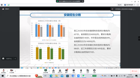 第一次宣讲会在1月25日下午,线上进行。参加宣讲的员工大多是高三生。在宣讲中,实践组员向员工展示了准备好的数据统计图,帮助他们了解历年招生情况,并鼓励他们在高三最后的冲刺期间努力学习,取得好成绩。一些员工表达了想要报考西工大的意愿和想要航空报国的梦想,实践队员传授了自己的高考经验,回答了他们的问题。
