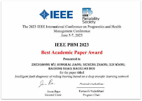 6月5日至6月7日,2023年IEEE故障预测与健康管理国际会议(2023 IEEE Conference on Prognostics and Health Management,IEEE PHM 2023)在加拿大蒙特利尔举行。英国威廉希尔英文官网2021级博士生吴正红做题为“Intelligent fault diagnosis of rolling bearing based on a deep transfer learning network”的口头报告并获最佳学术论文奖。