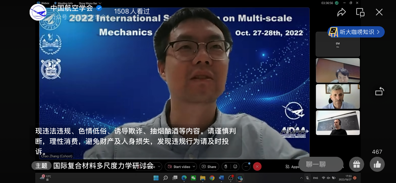10月27日-28日,由威廉希尔williamhill官方网站联合意大利都灵理工大学、韩国首尔国立大学共同主办的2022复合材料多尺度力学国际学术研讨会线上举行并通过中国航空学会微信视频号同步直播。来自多个国家的70余名专家学者线上参会,其中国外学者30余名;1500余人通过直播平台参会。