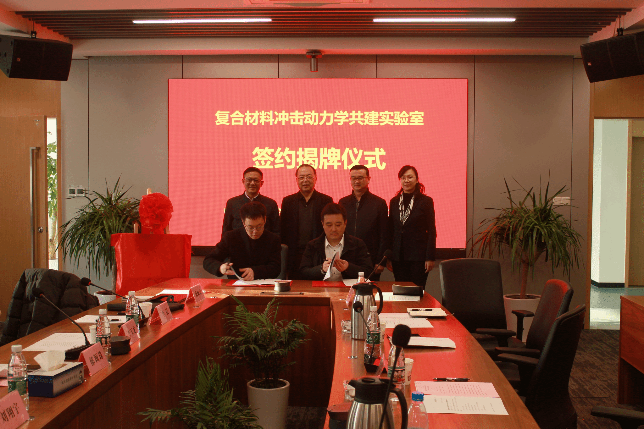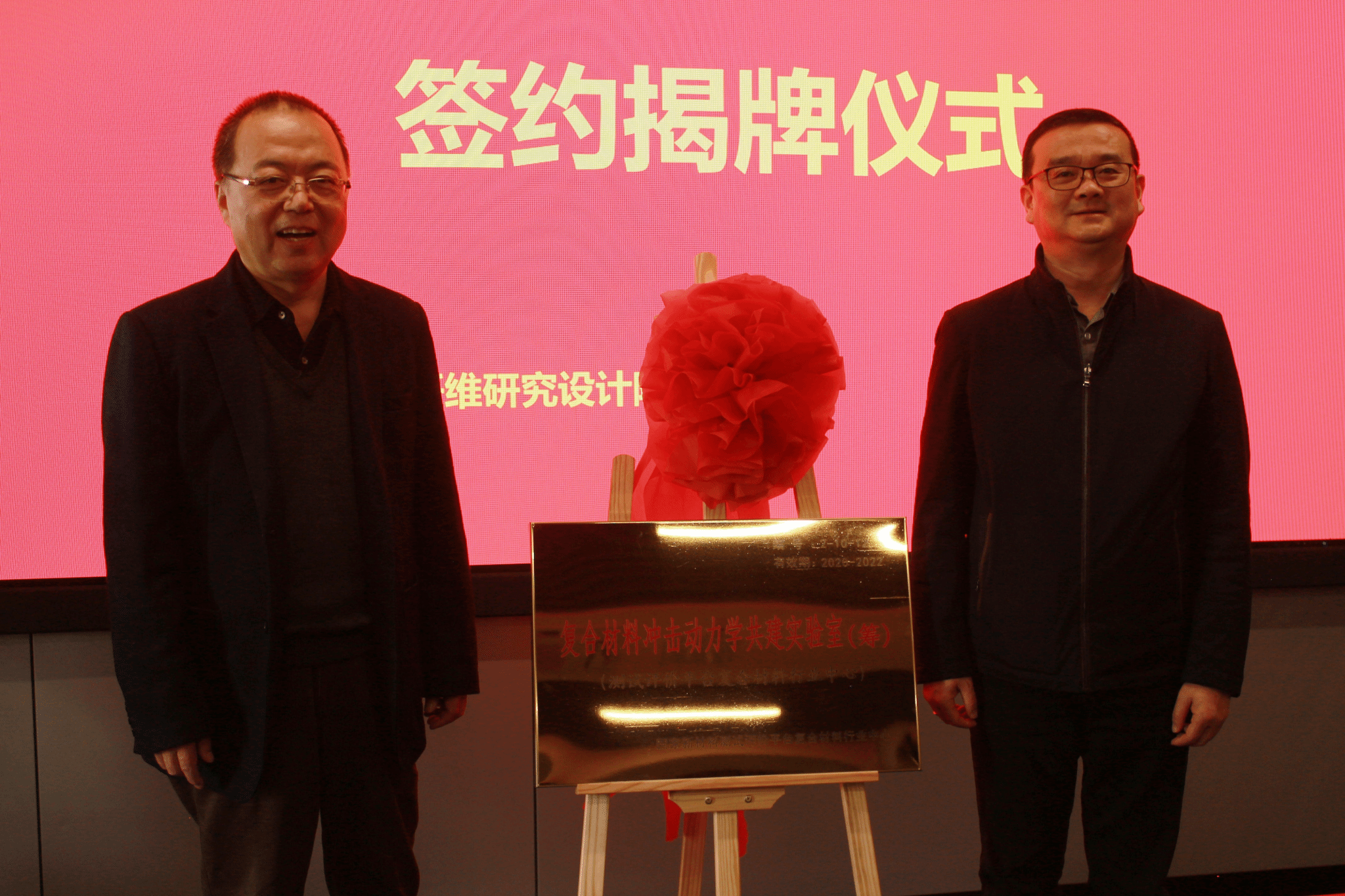 英国威廉希尔英文官网经理李玉龙和南京玻纤院经理王屹为“复合材料冲击动力学共建实验室”揭牌。