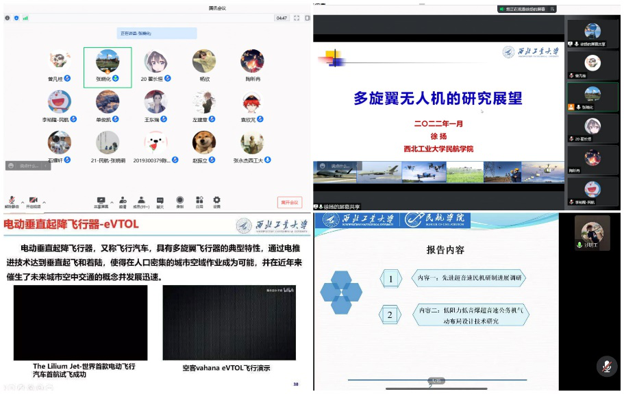 紧接着,王林兵副教授以“智能化赋能民航更高效安全”为题,首先用一个简短视频清晰演示了增材制造过程,然后讲述了增材制造的含义、分类,以及主要增材制造技术的优缺点。讲述了中国和美国增材制造火箭发动机、卫星和大飞机零部件的具体情况以及相对于传统制造取得的极大优势。“多旋翼无人机的研究展望”及“低阻力低音爆超音速公务机气动布局设计技术研究”由徐扬副教授和沙明工助理教授分别主讲,两位老师均带来了内容十分丰富而精彩的讲座。