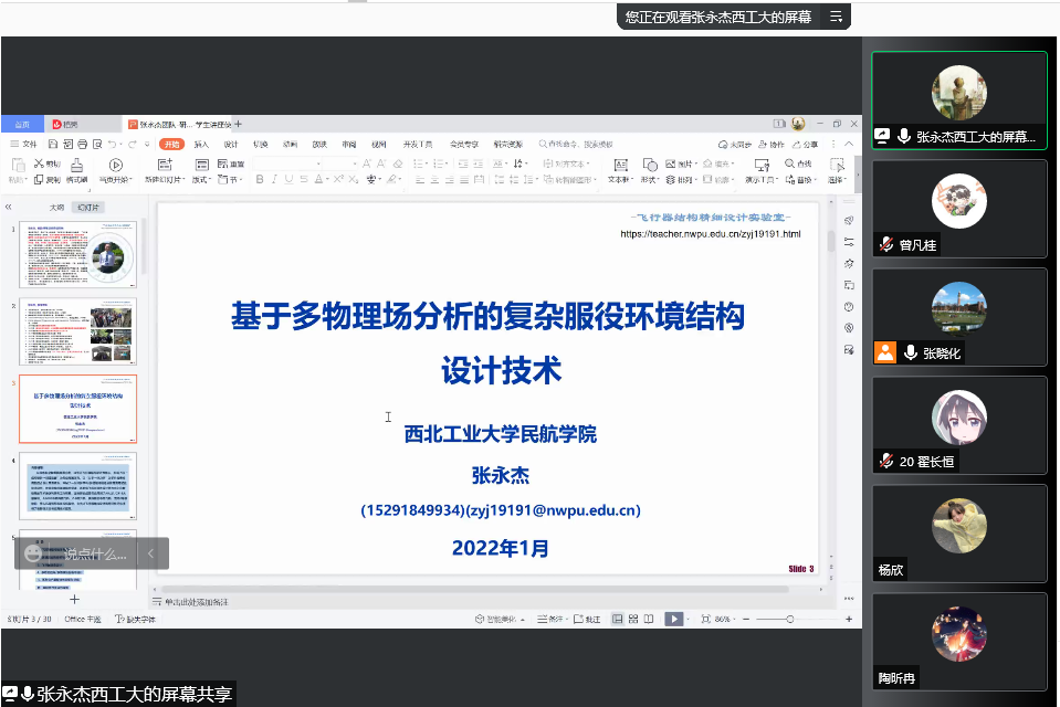 首先,张永杰教授以“基于多物理场分析的复杂服役环境结构设计技术”为主题进行了报告,从绿色航空和军民两用出发,以先进飞行器结构设计为核心,结合研究成果,列举项目实例,对专业知识理论进行深入浅出的讲解。目前张永杰教授已开展一系列多学科/多物理场理论分析方法与试验技术研究,在复杂服役环境结构设计、系列化飞机共通性设计等方向上具有较高的学术造诣和研究工作积累,部分研究成果已应用到了ARJ21大型客机、AG600水陆两栖飞机、无人机等预研和在役机型中,为先进飞行器结构设计和经济性评估提供了创新性方法与应用技术指导。